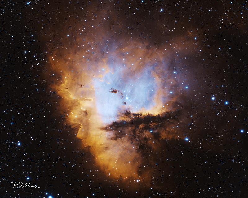 The whimsically named PacMan Nebula (NGC 281) is an emissions nebula in the constellation Cassiopeia, visible in northern skies from late spring to early fall.