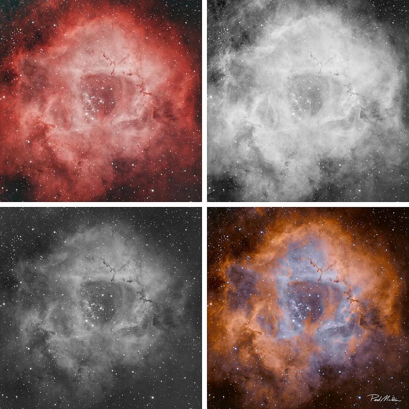 This is the Rosette Nebula (C50), an iconic cloud of dust silhouetted against glowing ionized gases in the constellation Monoceros. The rosette name is less of a Rorschach test than for some nebulas, but others see the shape of a skull in these clouds!
