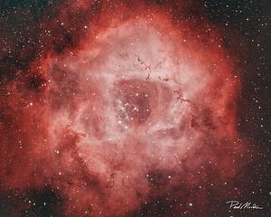 This is the Rosette Nebula (C50), an iconic cloud of dust silhouetted against glowing ionized hydrogen (shades of red) in the constellation Monoceros. The rosette name is less of a Rorschach test than for some nebulas, but others see the shape of a skull in these clouds!