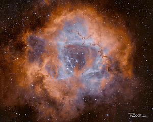 This is the Rosette Nebula (C50), an iconic cloud of dust silhouetted against glowing ionized hydrogen (shades of red-gold) and oxygen (shades of blue) in the constellation Monoceros. The rosette name is less of a Rorschach test than for some nebulas, but others see the shape of a skull in these clouds! This image combines 16 hours of five-minute and ten-minute exposures from a 115mm refractor telescope, taken from my Indiana backyard in February 2023. For more technical details, please see: https://www.astrobin.com/hmfzl1