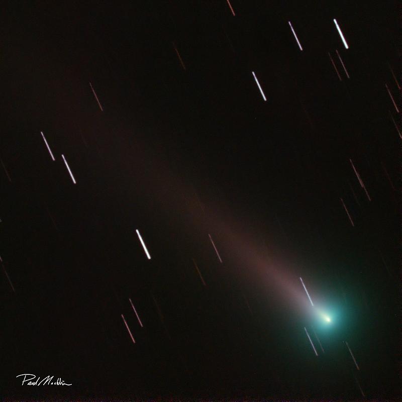 This is Comet C/2021 A1 Leonard on December 2, 2021, showing one hour of its travel against the background star field. I combined 120 thirty-second exposures (at about a 1400mm focal length) to make this photo, using an 8" reflecting telescope from my Indiana backyard. Interestingly, the comet was moving so fast that even 3 minute exposures blur the core.